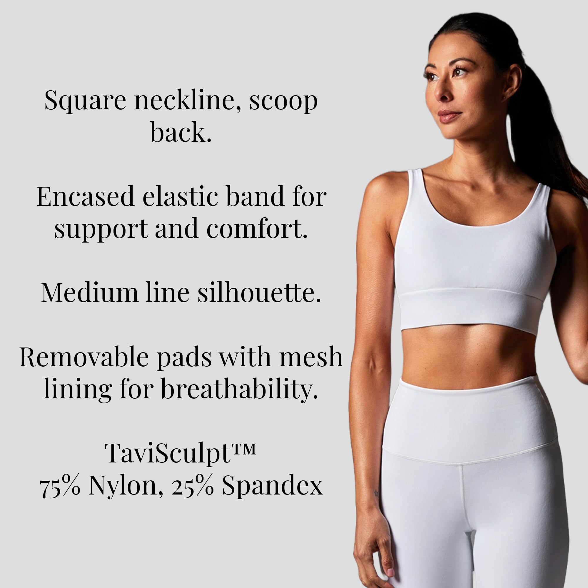 - Sports Bra For Women: This Tavi Empower Bra is comfortable and supportive for both the studio and beyond. The flattering look has a clean square neckline, scoop back, encased elastic band, and laminated straps.