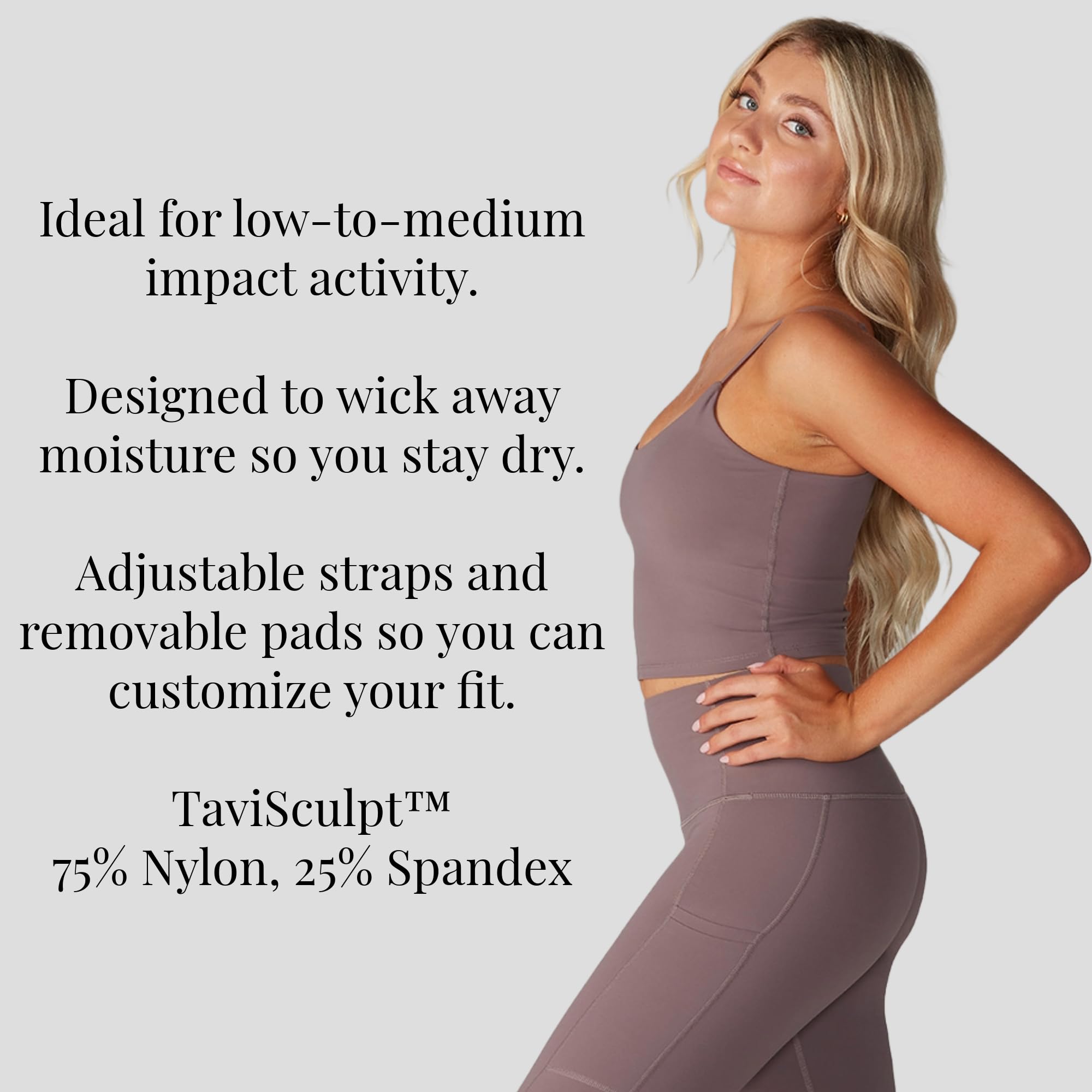 • FOR LOW TO MEDIUM IMPACT ACTIVITIES: The cropped camisole bra is ideal for low-to-medium impact activities. Perfect for your studio sessions, this top will become a workout wardrobe staple.