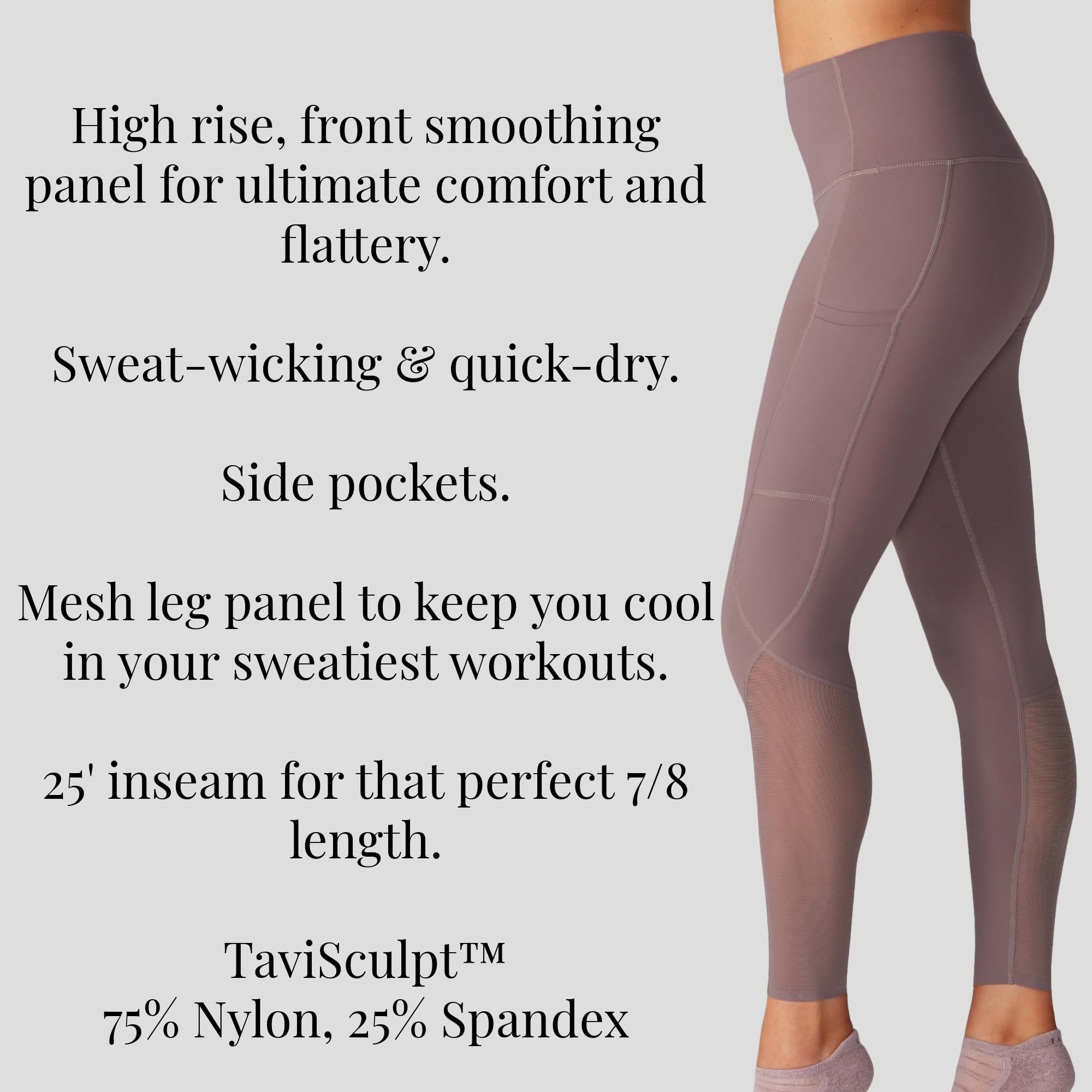 - COMFORTABLE MATERIAL FOR IDEAL FIT: The high-end material is made with 75% nylon and 25% spandex and has an inseam of 25-inches. These perfect 7/8 workout leggings were designed to fit, flatter, and flow.
